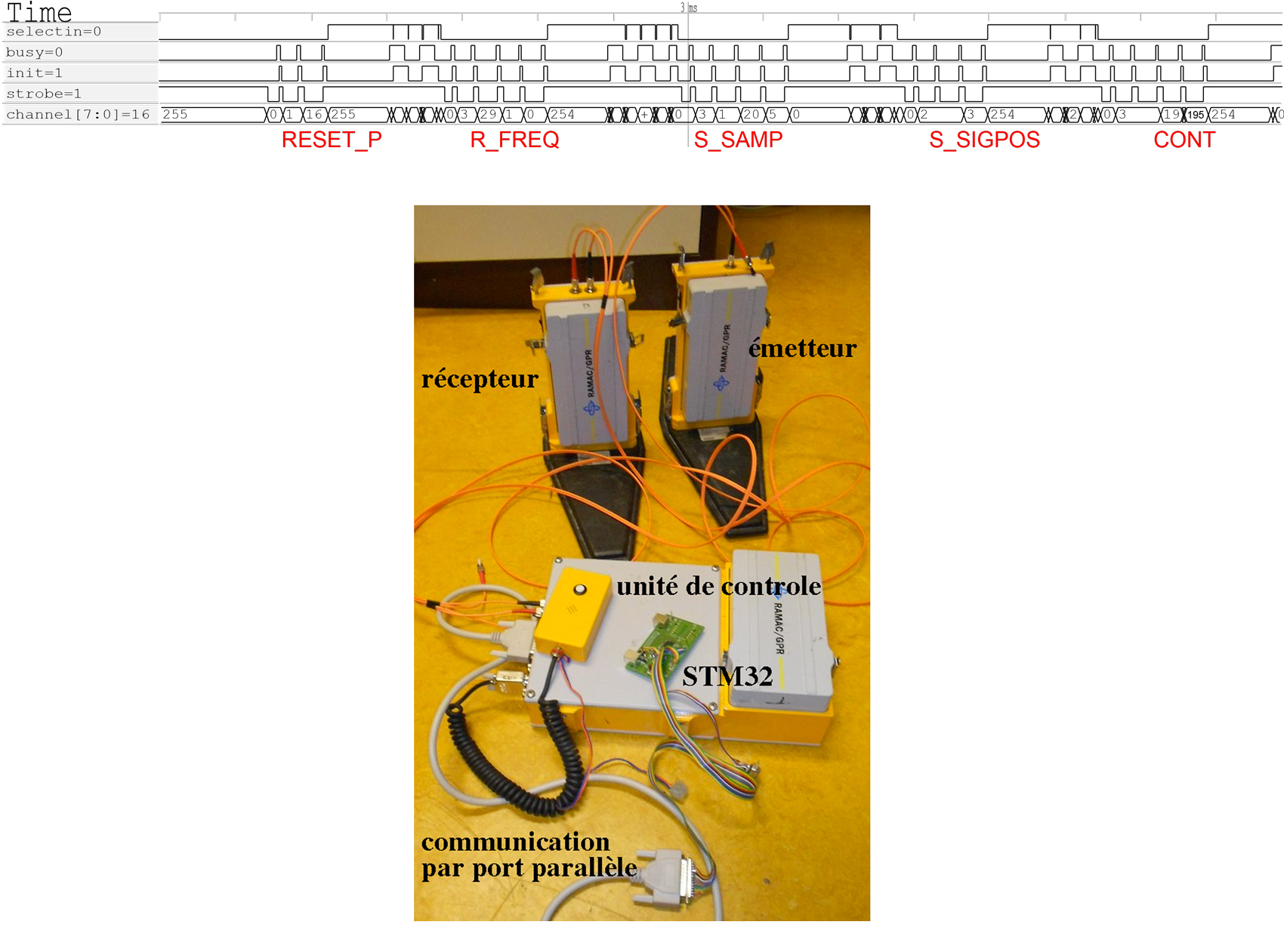 L’extrait de programme ci-dessous propose une implémentation de la fonction d’écriture entre le STM32 et l’unité de contrôle du RADAR RAMAC (la fonction de lecture est trop longue et sans nouveauté pour être présentée ici, mais est disponible dans l’archive de programmes associée au manuscrit de cet article sur les sites http://jmfriedt.free.fr et www.trabucayre.com5. Connaissant le protocole de communication qui a été sondé par un analyseur logique Logic Sniffer6, les diverses séquences de manipulation de l’état des broches sont implémentées de façon logicielle. La séquence des commandes, dont seules les premières étapes d’initialisation sont décrites ici (Fig. 4, haut), consiste à placer l’unité de contrôle en liaison de données bidirectionnelles sur 8 bits, lecture de la fréquence de fonctionnement (R_FREQ), définition du nombre d’échantillons acquis (S_SAMP), position du début d’acquisition des échos par rapport à l’impulsion d’excitation (S_SIGPOS), et relance d’une acquisition temporairement interrompue (CONT).