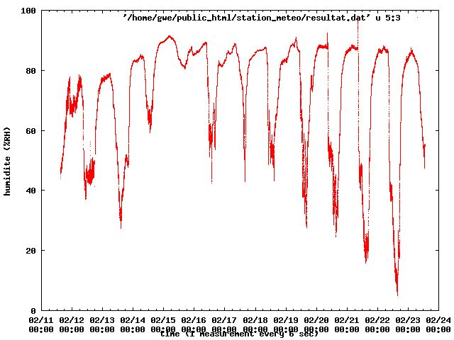 Le STM32 est mis en attente d’un front montant (et donc de la fin de la capture) (l.5), les valeurs mesurées sont disponibles dans le registre relatif au canal 2 pour la période (l.7) et au canal 1 pour la durée de l’état haut du signal (l.9). Nous convertissons la valeur de la période en une durée (l.11) puis en une fréquence en kHz (l.12) et nous réalisons le calcul pour obtenir le taux d’humidité.