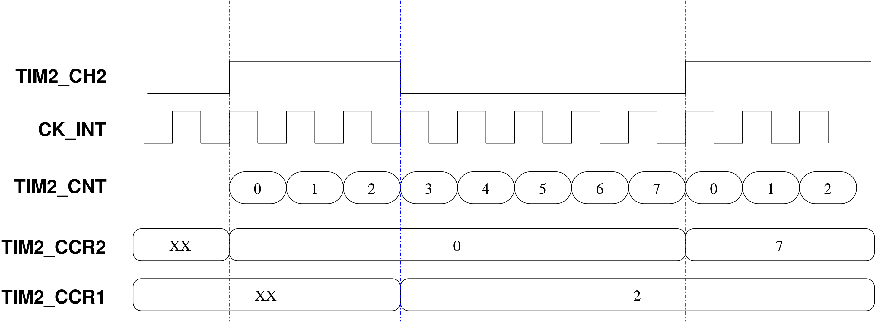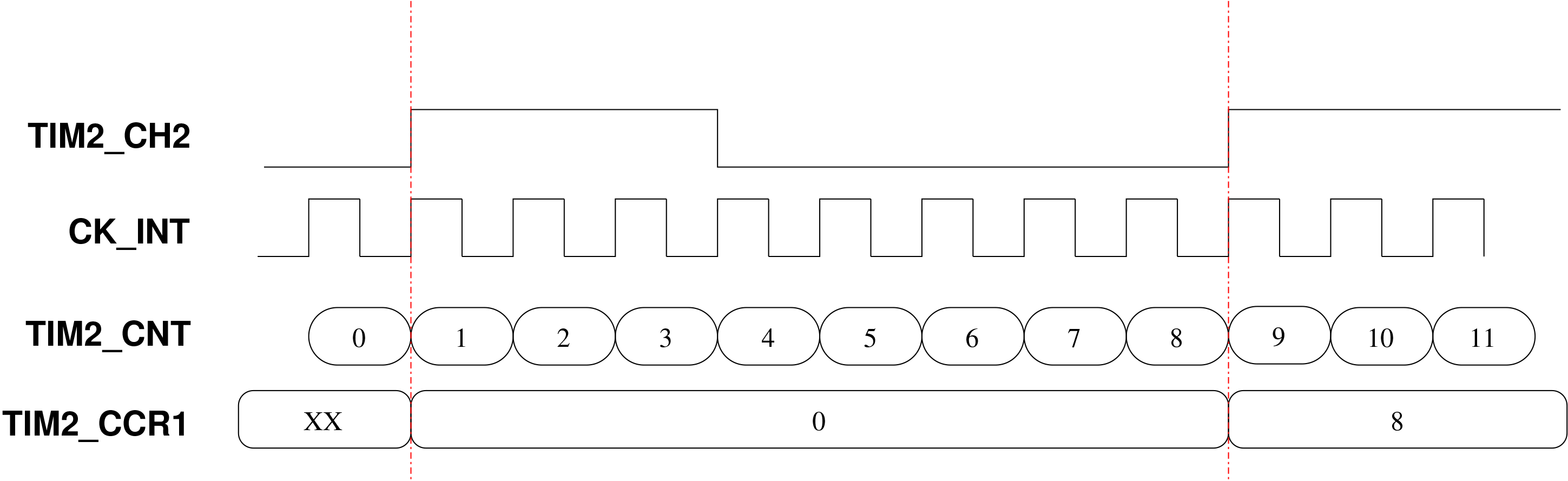 Du point de vue de la configuration, les 4 canaux partagent le registre TIM2_CCER, TIM2_CH1 et TIM2_CH2 partagent TIM2_CMR1 et TIM2_CH3 et TIM2_CH4 partagent TIM2_CMR2