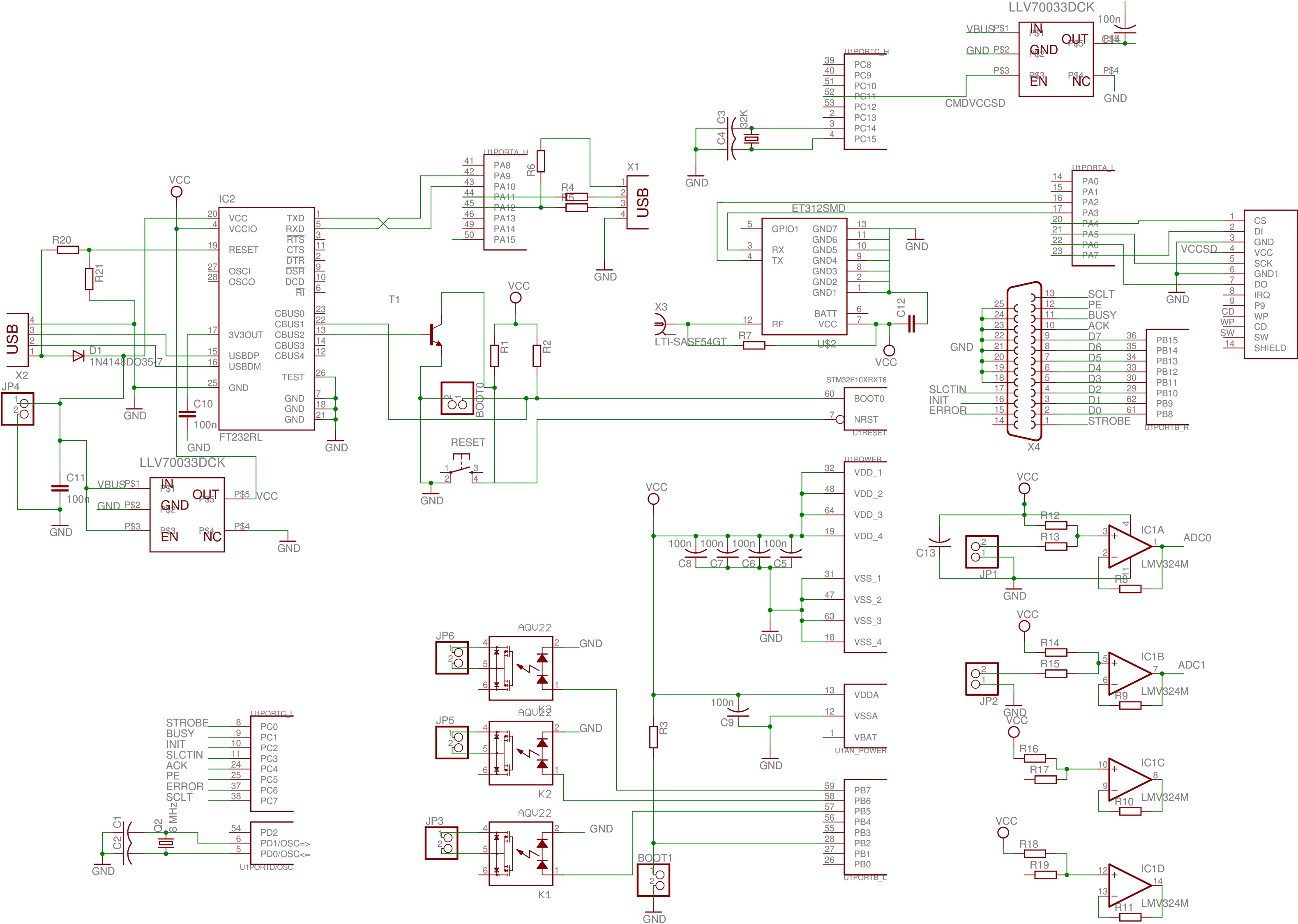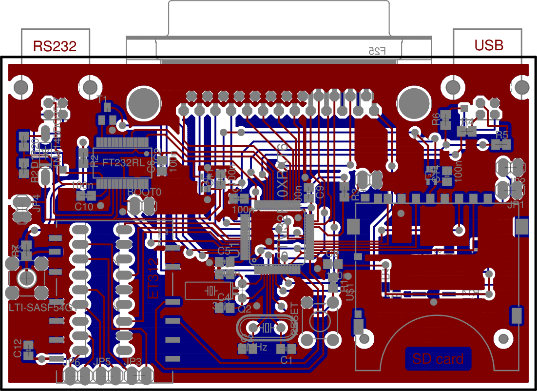 Pour notre part, nous nous proposons d’exploiter un circuit dédié, spécifiquement développé en vue d’émuler le port parallèle d’un PC, fournissant ainsi accès à la majorité des signaux utiles mais surtout illustrant le peu de composants annexes nécessaires au fonctionnement de ce microcontrôleur : un quartz 32,768 kHz, éventuellement un quartz 8 MHz, et des condensateurs de découplage aux 4 coins pour filtrer l’alimentation (Figs. 1 et 2). Ce circuit comporte par ailleurs un convertisseur USB-RS232 pour fournir une interface communément disponible sur tout PC récent. Nous verrons deux applications de cette carte, dans un cas pour émuler le comportement du port parallèle d’un PC pour le contrôle d’un instrument (section 5), et, plus ambitieux, la réalisation d’une station de mesure météorologique (section 8).