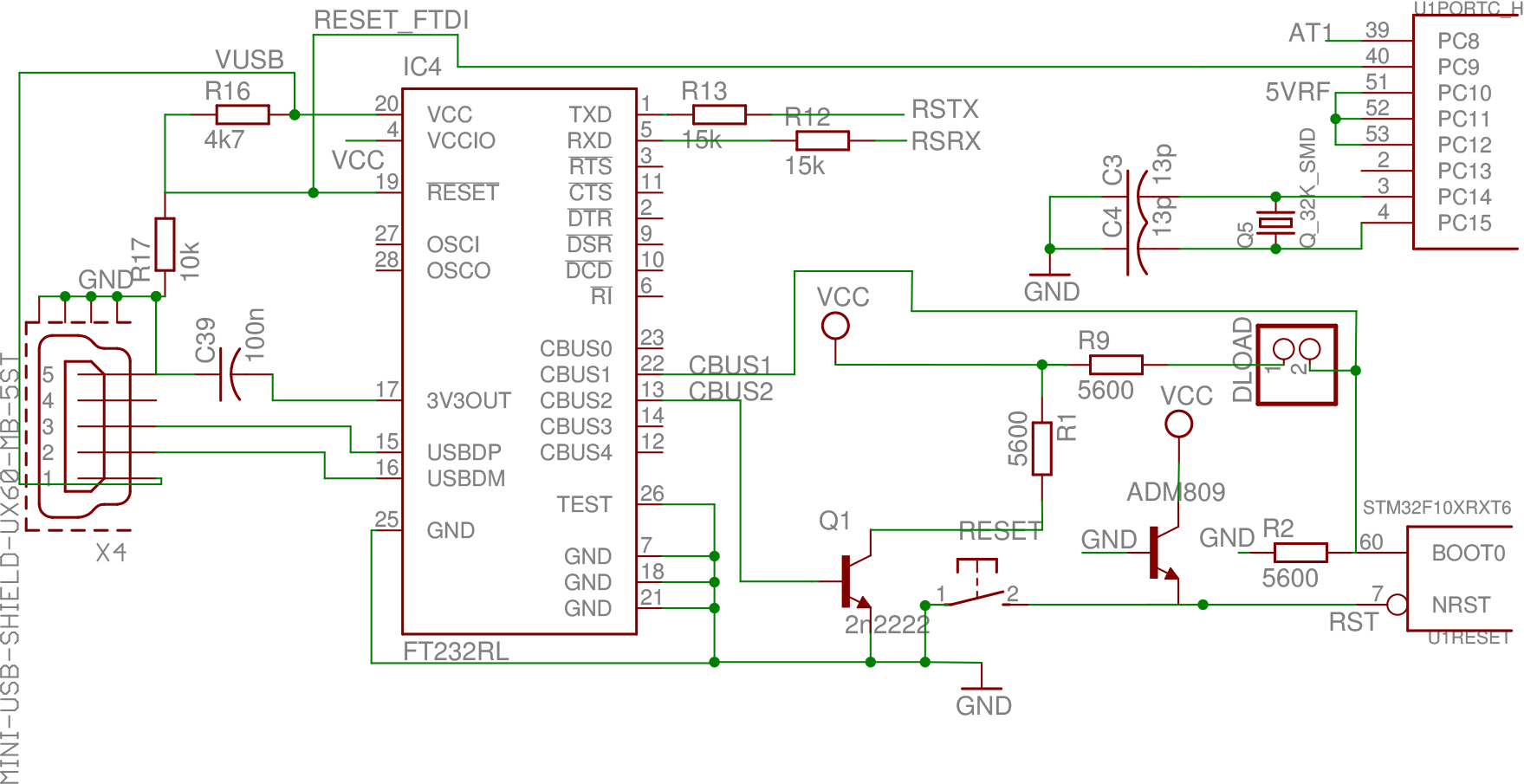 Le -w signifie que le fichier main.bin doit être écrit en flash, le -g 0x0 spécifie l’adresse où commencera l’exécution (0x0 correspond au début de la flash). Nous proposons une modification du module ftdi_sio.ko permettant de manipuler deux broches du composant servant de convertisseur USB-RS232 (FT232RL) et de stm32flash pour manipuler ces deux signaux lors de la programmation3. Ces manipulations nécessitent néanmoins un transistor monté en circuit inverseur pour palier à l’état par défaut (incorrect) des broches du FT232RL, et d’un circuit de gestion du reset, Analog Devices ADM809, pour retarder l’impulsion d’initialisation lors de la mise sous tension et ainsi permettre au FT232RL de stabiliser l’état de ses sorties avant que le microcontrôleur ne tente d’exécuter son application (Fig.3). Une présentation plus détaillée des possibilités de “détournement” des FTDIs fera l’objet d’un futur article.