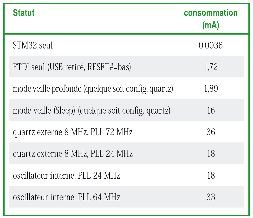 Après configuration de la RTC, nous réalisons nos traitements. Quand ceux-ci sont finis, nous fixons le moment où la RTC va produire son interruption et nous rentrons dans la fonction qui passe le STM32 en mode basse consommation. La boucle infinie ne sera finalement jamais atteinte car à la sortie de WFI le STM32 sera réinitialisé. Les mesures de consommation (table 1) se font dans un premier temps avec un convertisseur série-USB FT232RL en mode veille (RESET# en position basse), avant que les résultats excessivement élevés nous obligent à effectuer une mesure finale avec le STM32 seul, en mode veille, sans aucun composant périphérique autre que les condensateurs de découplage et les quartz. Lors de la présence du FTDI, la liaison asynchrone entre le FTDI (TX et RX) et le STM32 se fait au travers de résistances de 36 kΩ.