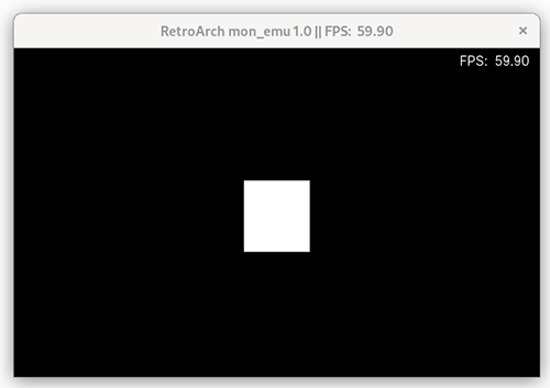 Ce qui nous permet d’admirer le résultat de notre programme, un magnifique carré blanc sur fond noir (Fig. 1). On peut en profiter pour tester quelques fonctionnalités de RetroArch : redimensionnement de la fenêtre, passage en mode plein écran (touche <F>), affichage du frame rate (touche <F3>)… La liste complète des raccourcis clavier de RetroArch est disponible sur la page [5].