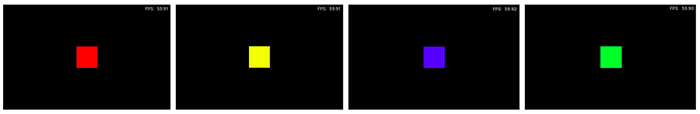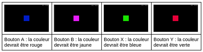 Le carré devrait maintenant changer de couleur en fonction de la touche de la manette. Mais bizarrement, ce ne sont pas les couleurs attendues qui s’affichent (Fig. 2) !