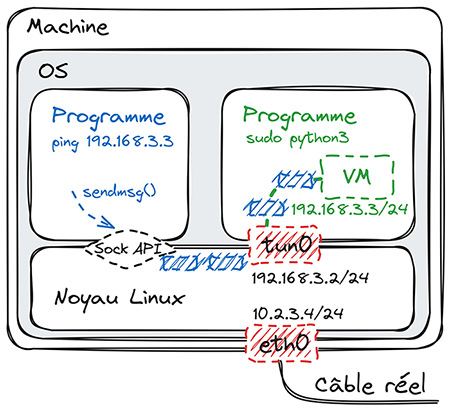 Regarde la partie « noyau Linux » en bas. Quand tu commences à t’embrouiller, le mieux est de revenir à l’analogie avec les interfaces réseau physiques. Là, on a configuré notre interface virtuelle tun0 de la même façon qu’on aurait configuré une vraie interface, par exemple eth0 sur mon dessin. Ce qui diffère, c’est que sur eth0 on a connecté un vrai câble réseau, pour communiquer avec de vraies machines ; alors que sur tun0, on a connecté un programme, qui devra simuler quelque chose. En l’occurrence, notre programme, c’est l’interpréteur Python. Et ce qu’on veut simuler, c’est une machine qui répond au ping. Maintenant, regarde à gauche. Tout à l’heure, on va lancer un ping vers l’IP de cette machine qu’on simule. J’ai choisi 192.168.3.3 pour cette IP. Comme tu le sais sûrement, la commande ping envoie des paquets réseau ICMP « echo request » et attend des paquets ICMP « echo reply » en retour. Ces paquets « echo request », dessinés en bleu, sont générés via l’API socket, puis routés par le noyau Linux. Ils auront pour destination 192.168.3.3, donc le noyau les enverra vers tun0, plutôt que eth0, puisque le sous-réseau 192.168.3.0/24 correspond. Du coup, plutôt que d’être transmis sur un vrai câble réseau, ils seront transmis à notre programme Python. À ce moment-là, notre programme aura juste à générer un paquet « echo reply » et à le renvoyer dans l’autre sens, pour faire croire qu’une machine a répondu.