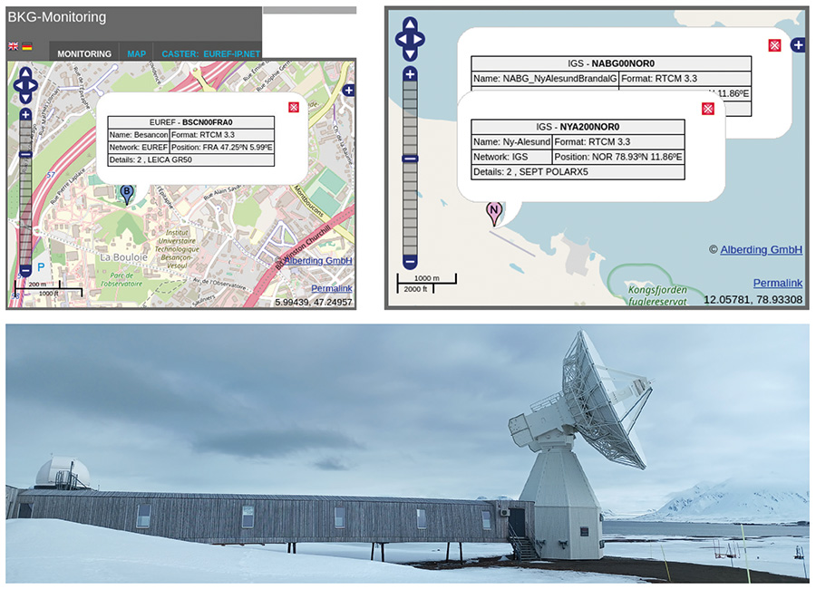 Alors que nous cherchions à identifier les spécifications de NTRIP et en particulier du serveur rédigé par l’institut géographique allemand BKR (Bundesamt für Kartographie und Geodäsie), nous avons découvert à https://igs.bkg.bund.de/ntrip un réseau de services incluant des stations de référence à Besançon et sur notre site d’études au Spitzberg ! (Fig. 8). Les casters NTRIP sont accessibles sur une adresse de la forme euref-ip.net:2101/MOUNT ou igs-ip.net:2101/MOUNT avec la source des signaux de référence MOUNT visible à http://igs-ip.net:2101/ par exemple, mais les requêtes à str2str -in ntrip://login:passwd@euref-ip.net:2101/NYA200NOR0 se soldent par :