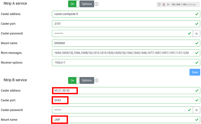 La station de base est formée d’un récepteur u-blox ZED-F9P connecté à une Raspberry Pi (3) exécutant l’image fournie par Centipède (https://docs.centipede.fr/docs/base/Installation.html) puisque ce projet autorise à configurer sa station de base pour émettre des trames de correction RTCM vers tout serveur NTRIP et pas uniquement caster.centipede.fr (Fig. 2), voire de dupliquer les échanges en proposant deux configurations de casters NTRIP. Côté serveur, l’exploitation du port 443 interdit bien entendu qu’un serveur web (Apache) s’exécute en même temps. Le mot de passe n’est pas pris en compte et n’importe quelle chaîne de caractères (non vide) conviendra.