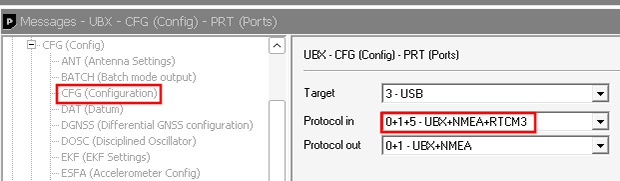 Nous avions auparavant [1] plébiscité la version de RTKLib pour Android comme solution pour recevoir deux flux de données – de correction par un serveur NTRIP et un récepteur u-blox ZED-F9P – afin d’appliquer les corrections et fournir la solution centimétrique. Force est de constater que RTKLib ne fonctionne plus sous Android 12, et qu’une alternative doit être trouvée pour poursuivre les mesures avec un téléphone mobile récent. Pour ce faire, nous tirons profit de la capacité d’un ZED-F9P d’exploiter un flux RTCM pour appliquer les corrections et fournir lui-même une solution centimétrique. Malgré la boîte noire que constitue la solution RTK du ZED-F9P, c’est une solution fonctionnelle largement adoptée. Pour ce faire, nous configurons le ZED-F9P pour recevoir les corrections RTCM sur port USB (figure ci-dessous) en vérifiant que cette fonctionnalité est activée au moyen du logiciel u-center, https://www.u-blox.com/en/product/u-center, qui fonctionne néanmoins sous Wine.