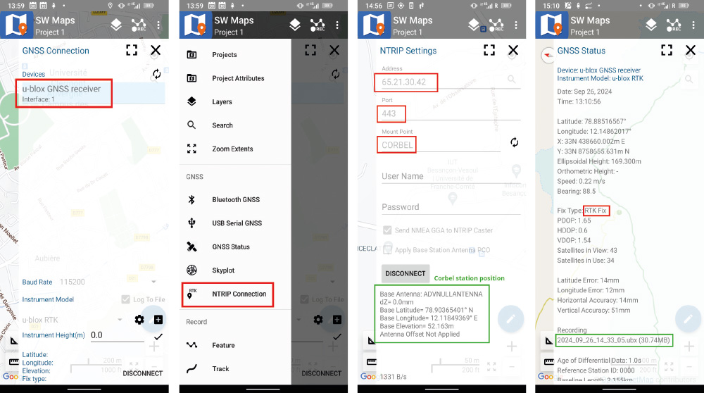 Par ailleurs, nous avons besoin d’un logiciel capable de recevoir les trames RTCM du serveur NTRIP, les communiquer au ZED-F9P, et recevoir la solution résultante. La seule solution gratuite, à défaut d’être libre, que nous ayons identifiée est SW Maps. Avec ce logiciel, connecter un ZED-F9P au port USB du téléphone portable se traduit par l’activation du menu USB Serial GNSS. Ayant sélectionné et activé la communication entre le ZED-F9P et le téléphone par interface USB, un nouveau menu s’active sous forme de NTRIP Settings. Nous y renseignons dans Address l’adresse IP de notre serveur NTRIP, sous Port le port (443) que nous avons choisi, sous Mount Point le nom de la station de référence renseignée dans l’interface Centipède, et si tout se passe bien avec une connexion fonctionnelle, nous sommes informés du transfert de données de quelques kilo-octets/seconde et des paramètres de la station de référence.
