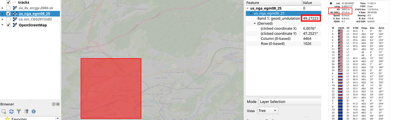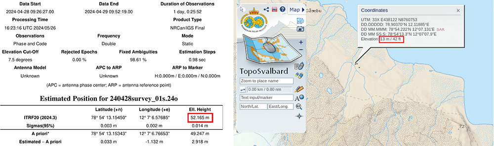 Lors de l’installation de la station de base, nous devons commencer par la position avec précision et exactitude. Pour ce faire, Centipède préconise d’enregistrer les données brutes (pseudoranges en code et en phase) observées par le récepteur de la station de base pendant 24 h, et calculer la solution précise PPP en exploitant les informations précises de position des satellites dans le ciel et de leur horloge, publiées par l’IGS, l’International GNSS Service dont les produits sont disponibles à https://cddis.nasa.gov/archive/gnss/products/ sous réserve de dévoiler son identité en fournissant une adresse e-mail. Alors que RTKLib sait effectuer ce calcul, une solution en ligne proposée par Centipède est d’utiliser le service de l’IGN qui ne fonctionne que sur le territoire français, et sinon le service canadien du NRCAN (Natural Resource of CANada) à https://webapp.csrs-scrs.nrcan-rncan.gc.ca/geod/tools-outils/ppp.php. Ici aussi, il faut dévoiler son e-mail pour accéder au service, qui demande un fichier RINEX d’observations toutes les 30 secondes : ce fichier est par exemple produit depuis le fichier UBX sauvé par un récepteur u-blox ZED-F9P par convbin -t 30 fichier.ubx pour produire le fichier d’observations .obs requis. Le traitement se fera en mode statique, la station de base n’étant pas mobile, et nous voyons apparaître le problème qui va se poser dans la suite quand nous devons remplir les champs concernant le référentiel avec soit NAD83, soit ITRF, et si le second choix est sélectionné alors « Vertical datum » impose CGVD2013. Afin d’exploiter convenablement les informations fournies par le récepteur mobile qui se référencera par rapport au récepteur fixe, nous devons comprendre le sens de ces acronymes. « ITRF » est International Terrestrial Reference system and Frame qui définit notamment la position de la Terre dans l’espace et sa forme, tandis que NAD83 est la même définition, mais pour l’Amérique du Nord. Comme nous travaillons en Europe, le choix d’ITRF semble naturel. Ensuite, CGVD2013 pour Canadian Geodetic Vertical Datum of 2013 propose la définition de l’altitude pour le Canada. Lorsque nous obtenons la solution du NRCAN sur la position de la station de référence, calculée une quinzaine de jours après la mesure pour exploiter les solutions les plus précises publiées par IGS, nous sommes informés de la solution en Fig. 3, entourée en rouge pour indiquer 52,165 m. Cela semble excessivement élevé, surtout que le site norvégien Toposvalbard à https://toposvalbard.npolar.no/ indique une élévation de 13 m. Quelle est la source de l’erreur ? Est-ce le fait d’utiliser un référentiel canadien en Europe ? Cela pose la question de la définition de l’altitude. Alors que nous avons l’habitude d’utiliser QGIS pour convertir d’un mode de projection horizontal vers un autre – par exemple de coordonnées sphériques vers un plan tangent local – ce logiciel ne nous sera pas d’une grande aide pour convertir des altitudes.