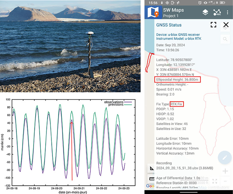 Lors de nos mesures sur le terrain, nous avons toujours pris soin de laisser tourner une instance de str2str -in ntrip://65.21.30.42:443/JMF -out file://sortie.bin pour conserver une trace des messages de correction et potentiellement les appliquer en post-traitement. En effet, alors que Ny-Ålesund vient d’installer récemment une station de base 4G [7] sub-GHz pour limiter les interférences avec les radiotélescopes permettant de communiquer de la donnée dans un rayon d’une dizaine de kilomètres, la couverture dans un cirque de glacier est incertaine, et sans signal de correction, point de mesure centimétrique. Cependant, une application telle que SW Maps sous Android (propriétaire mais gratuite) sauve un fichier contenant les données brutes venant d’un récepteur ZED-F9P en plus de se connecter au serveur NTRIP pour communiquer les informations de correction : en l’absence de connexion informatique, il sera toujours possible de post-traiter les deux jeux de données pour appliquer les corrections, avec le risque d’une solution qui ne converge pas si la qualité de l’enregistrement est insuffisante. C’est là le principal bénéfice de la solution RTK en temps réel : savoir si la solution centimétrique a été atteinte ou s’il faut attendre pour améliorer la convergence de la solution.