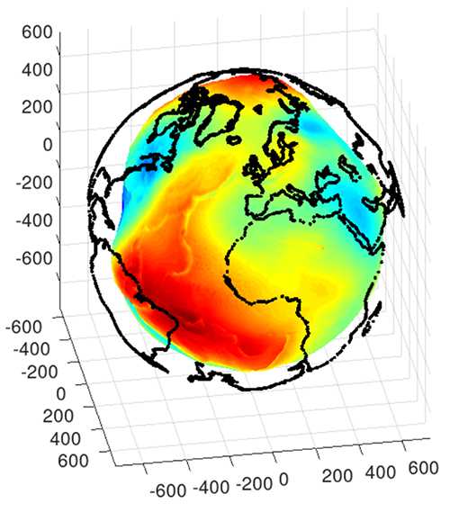 Nous avons tous vu ces superbes représentations de la distribution d’un champ sur le globe, que ce soit l’intensité du champ magnétique ou ici le champ de gravitation à la surface de la Terre [3], p. 240. Le résultat est surprenamment facile à atteindre en s’inspirant de sphere.m fourni par GNU/Octave dans /usr/share/octave/9.2.0/m/plot/draw/, en ajoutant le concept de rayon (puisque sphere trace une sphère de rayon constant) sous forme de la variable R ci-dessus, et en modifiant la couleur pour non plus dépendre de l’ordonnée (z), mais de la distance au centre de la sphère (variable C ci-dessus). Le programme ci-dessus atteint ce résultat pour la hauteur du niveau moyen de la mer sur le globe terrestre, en amplifiant d’un facteur 104 puisque le rayon moyen ajouté est de 640 m au lieu des 6400 km du rayon de la Terre.